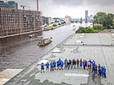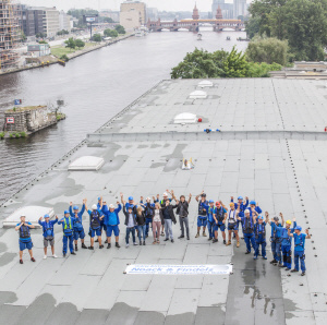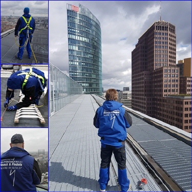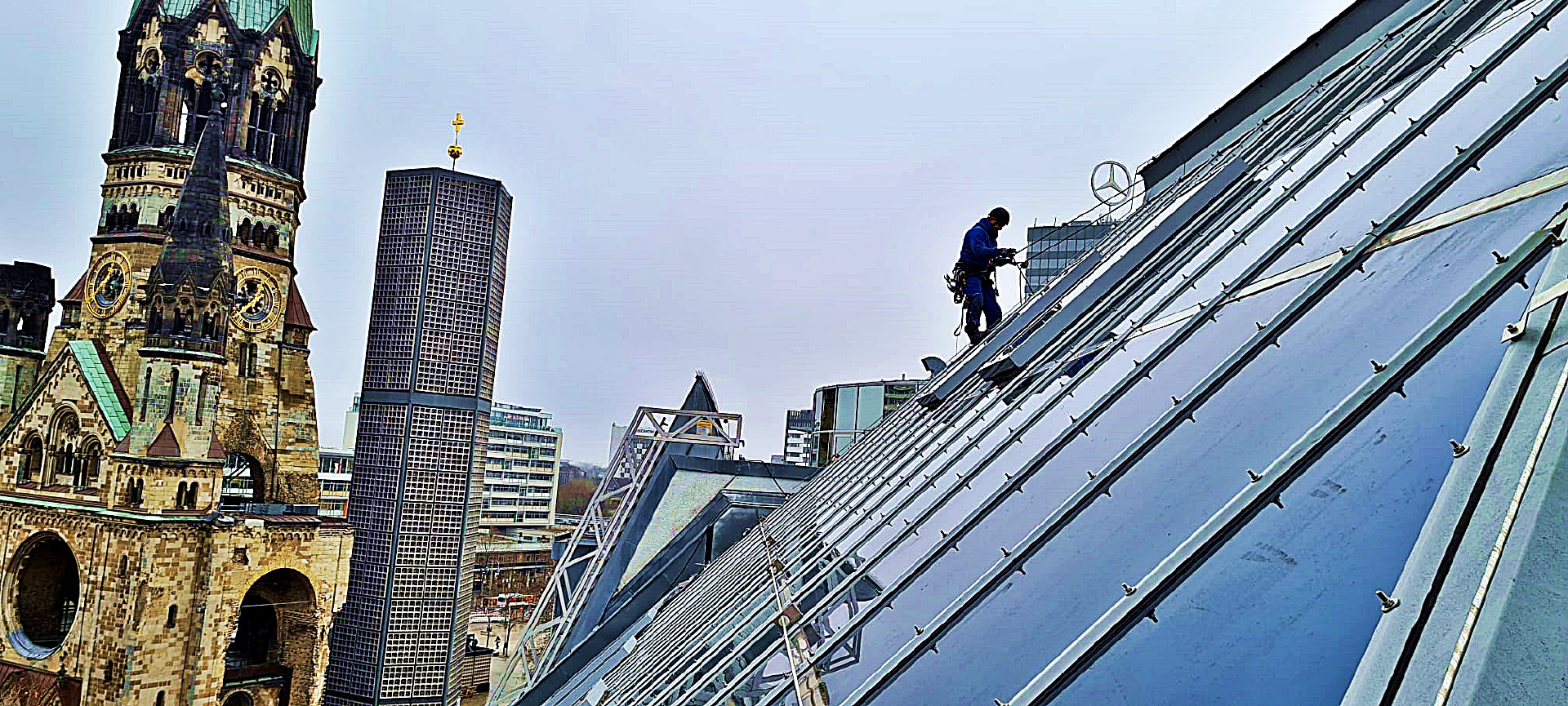 Mit neuen Herausforderungen ins neue Jahr. Die Installation der Fanganlage, auf der Glaskuppel des Marmorhaus am Ku´damm, stellt die Finalmontage des Blitzschutzes an diesem Gebäude dar.