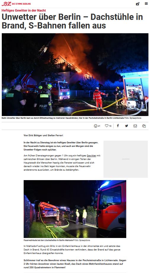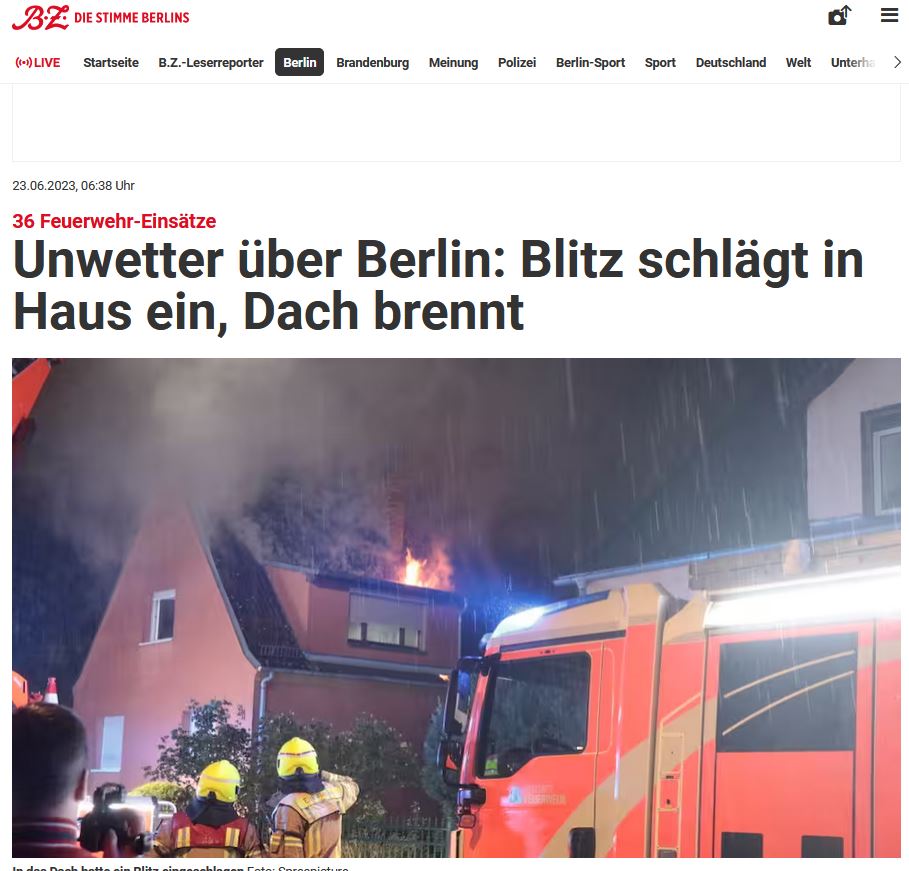 Wieder haben die Gewitter der letzten Tage zu einer Vielzahl von Blitzeinschlägen in Berlin & Brandenburg geführt.